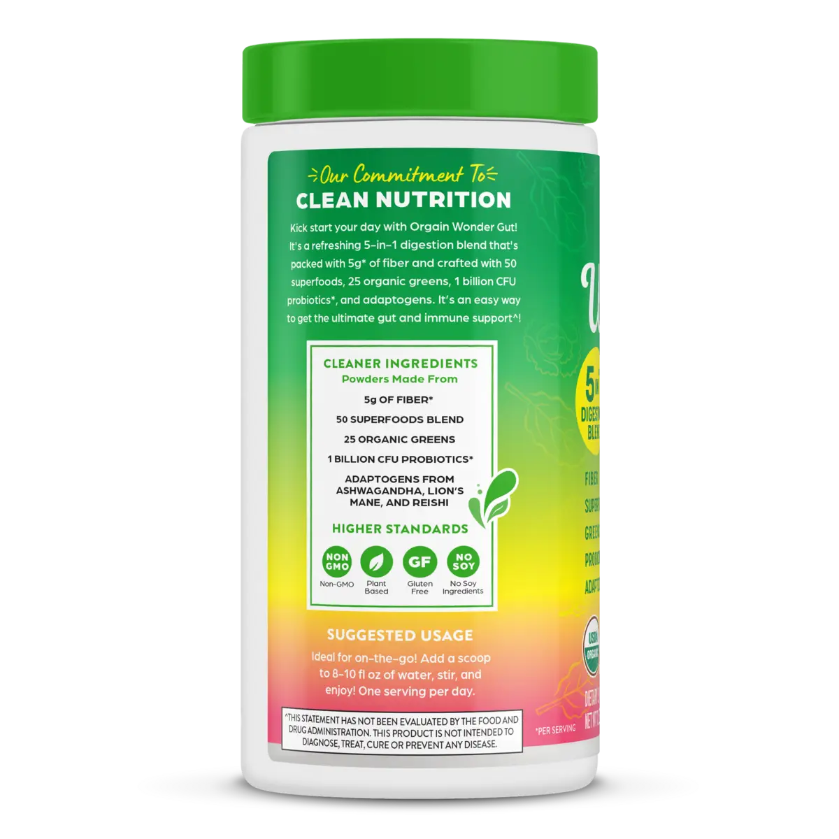 Wonder Gut is also an excellent source of vitamin C, which is all sorts of good news for your immunity. Made with the highest standards, this digestive mix is Certified Organic, non-GMO, Certified Plant-Based, gluten free, and contains no soy or artificial flavors or sweeteners Doctors often say that the microbiome is the second brain of the body¡ªso, it¡¯s time for a little brain food for your gut. Great for men and women alike. Just scoop, stir or mix this soluble powder, and give your gut the high five it deserves with a wonderful 5-in-1 mix. Go ahead and go guts with it.?